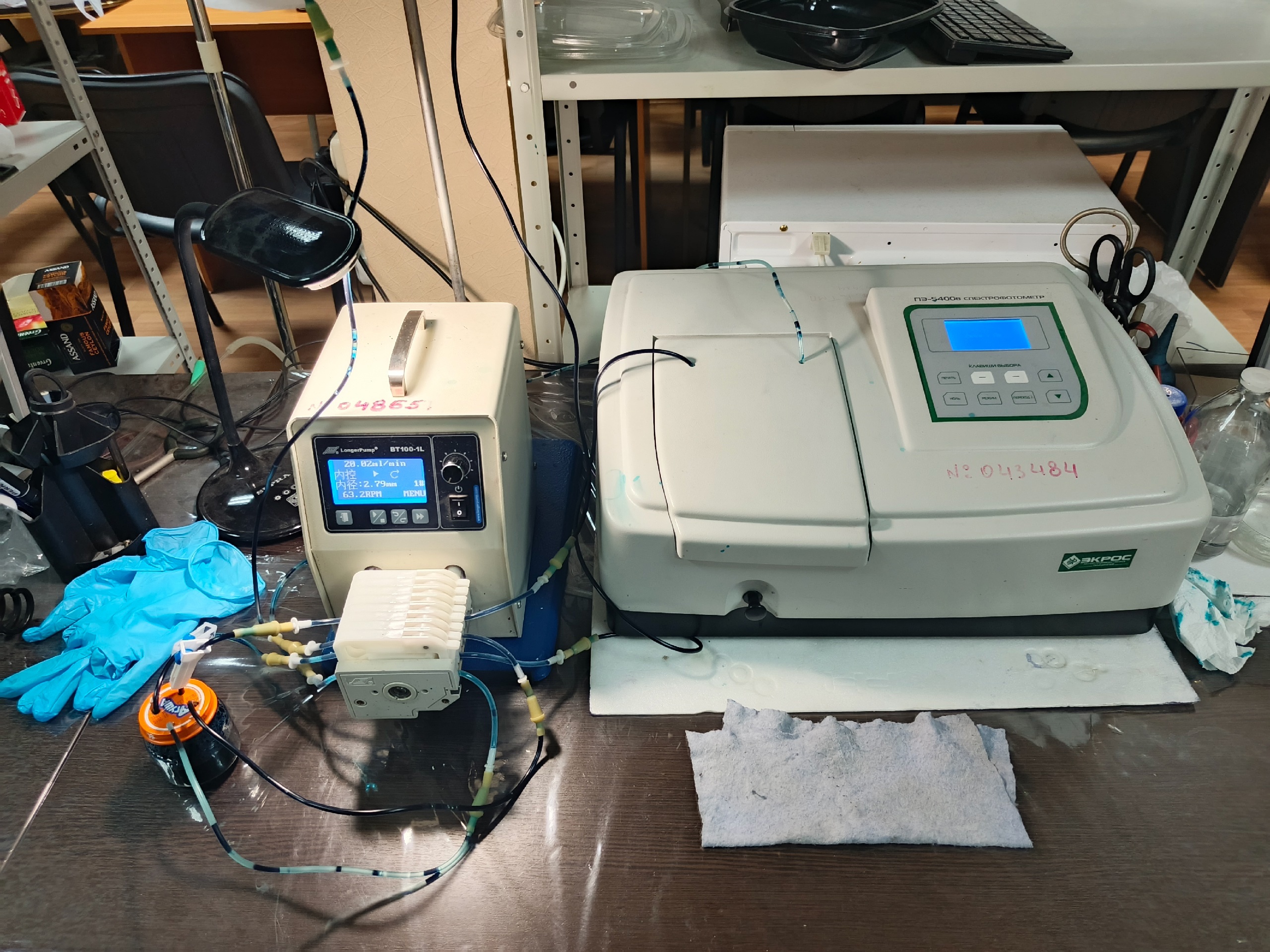 Рыбакова С.О. проводит динамическую сорбцию органического красителя малахитового зелёного на биоугле из персиковых выжимок, модифицированного углеродными нанотрубками.